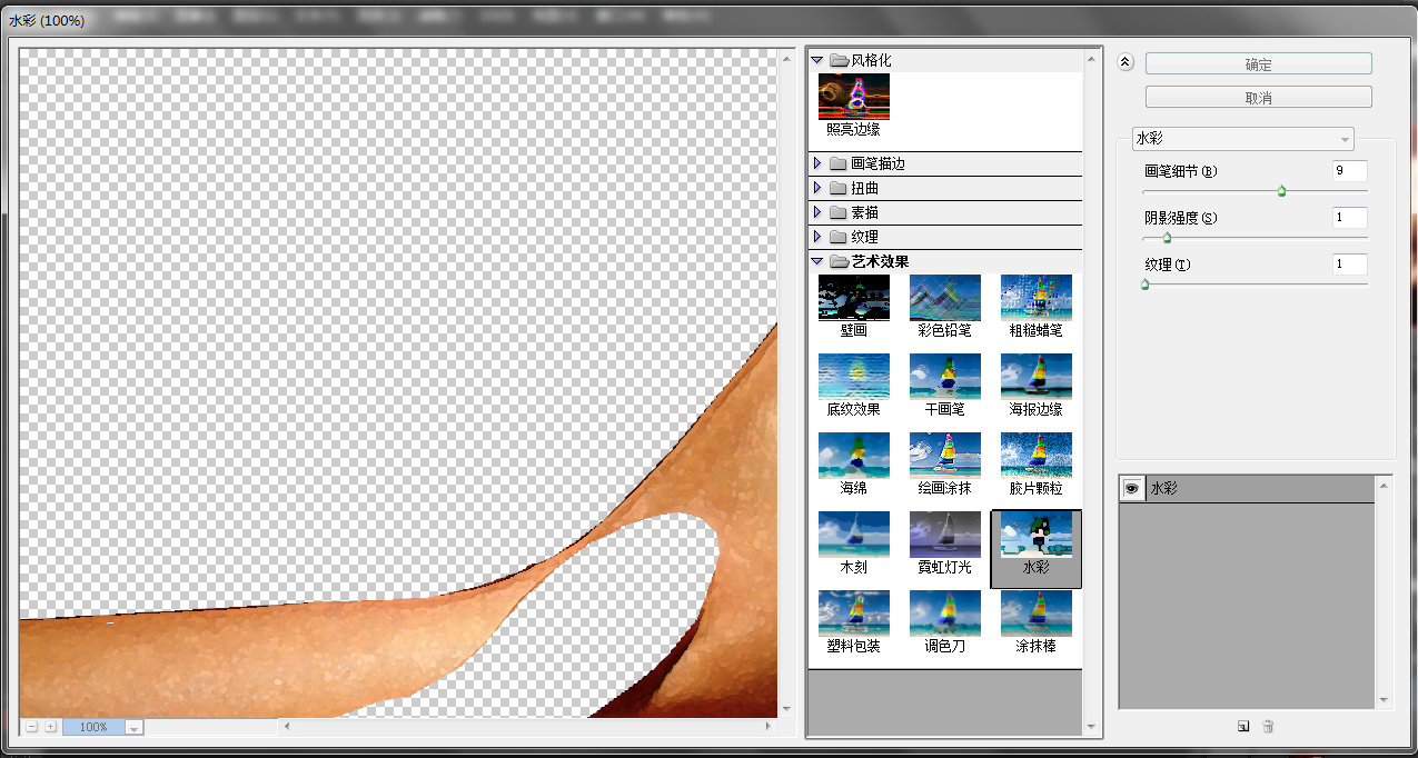 选择图层1副本,执行滤镜>艺术效果>水彩命令,设置参数从上到下依次为:8、1、3