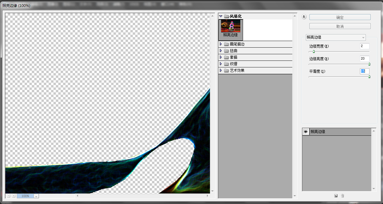 显示并选择图层1副本2,执行滤镜>风格化>照亮边缘命令,参数从上到下依次为2、20、15