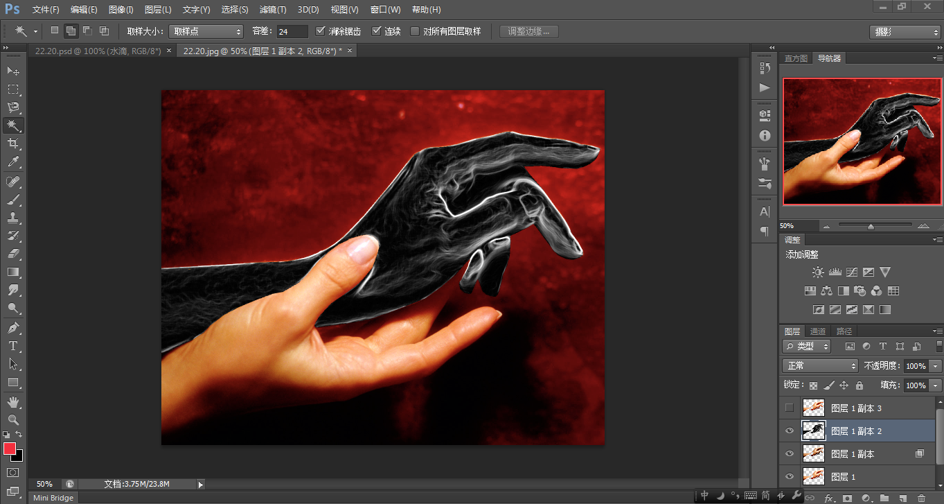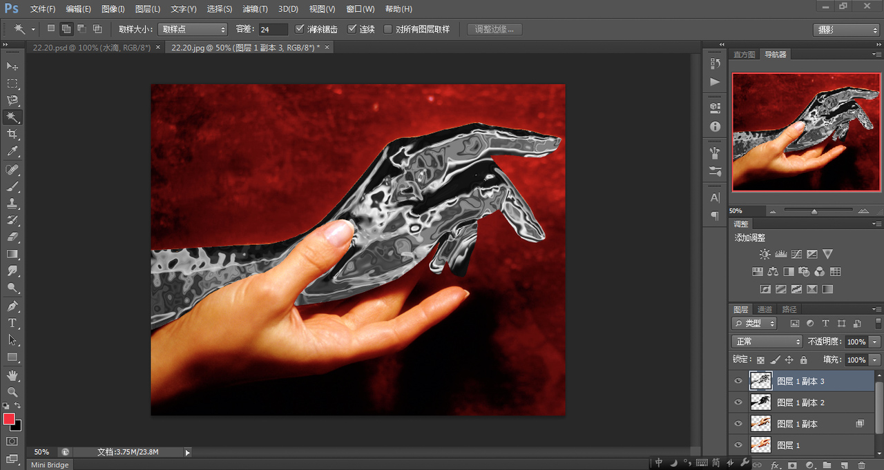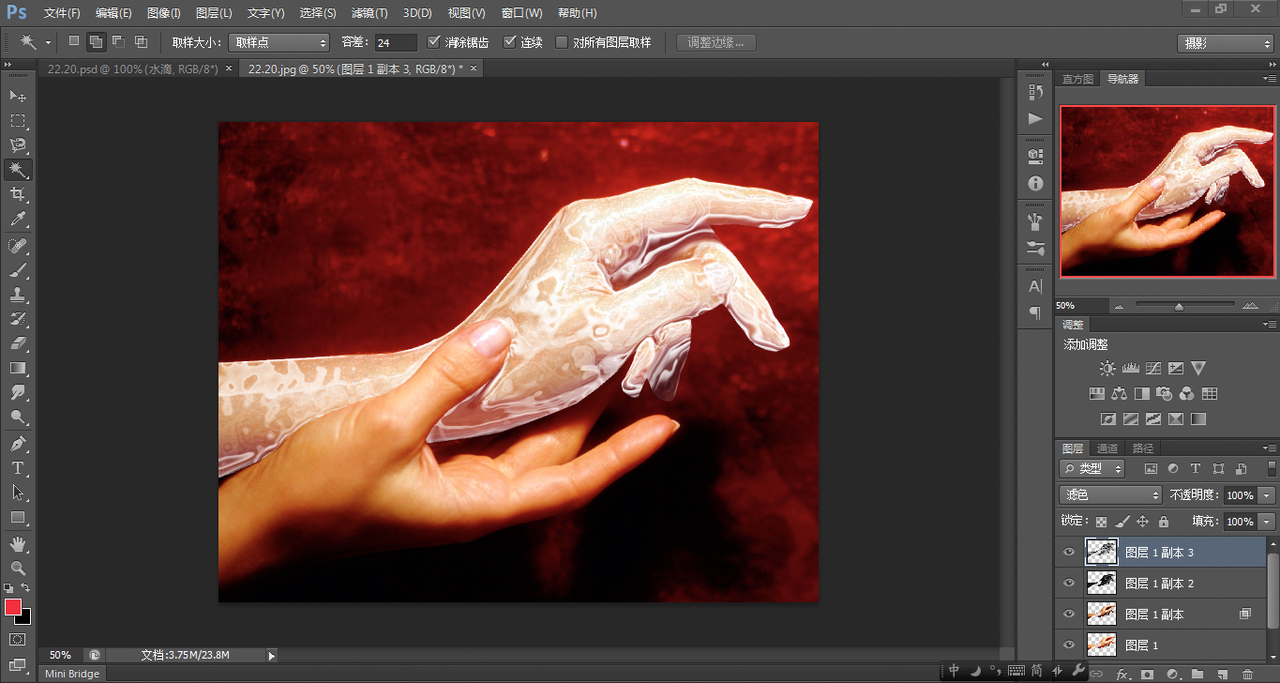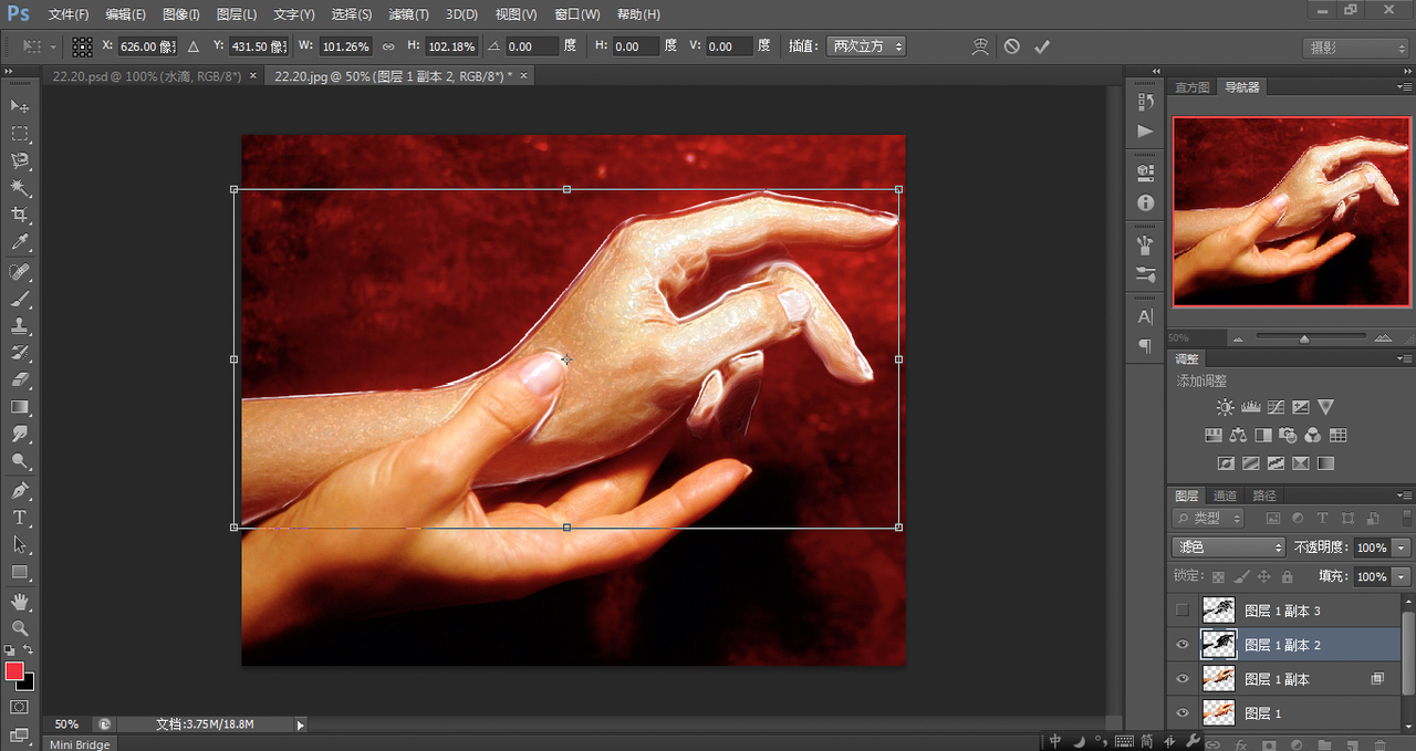 选择图层1副本2图层,显示定界框,稍稍移动上方和左方的控制点,使冰雕轮廓大于手的轮廓