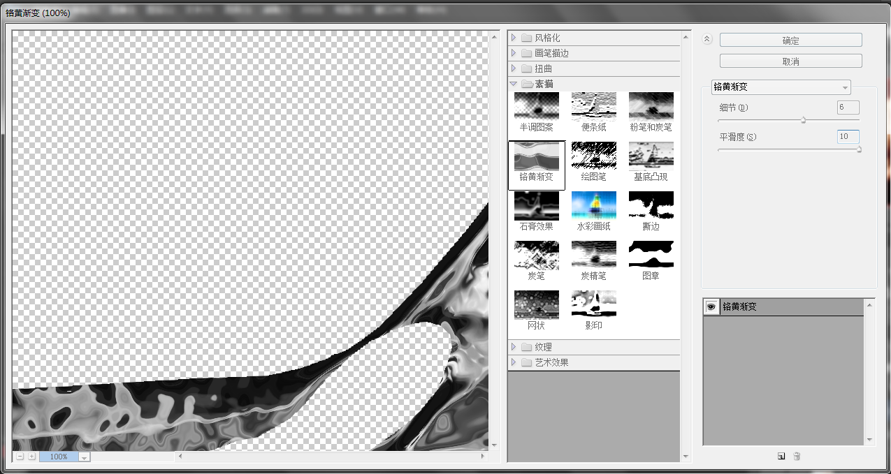 选择并显示图层1副本3,执行滤镜>素描>铬黄渐变命令,参数为6、10