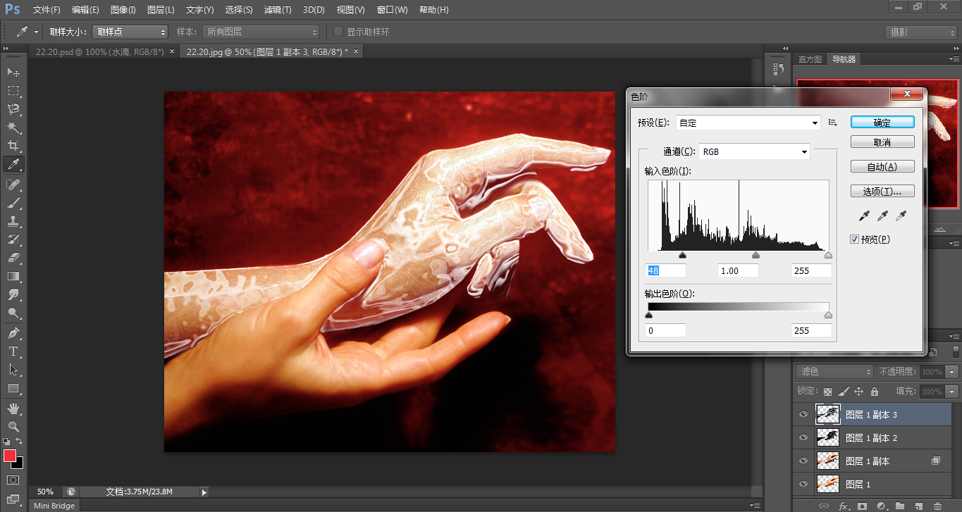 打开色阶对话框,向右拖动阴影滑块,将图像调暗,参数从左到右为48、1.00、255
