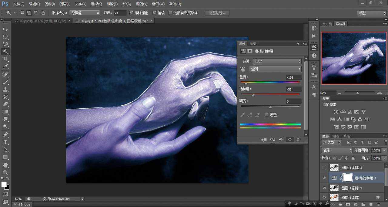 创建色相/饱和度调整图层,参数为-138、-58、0