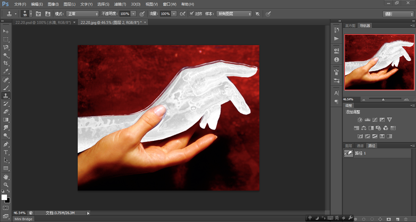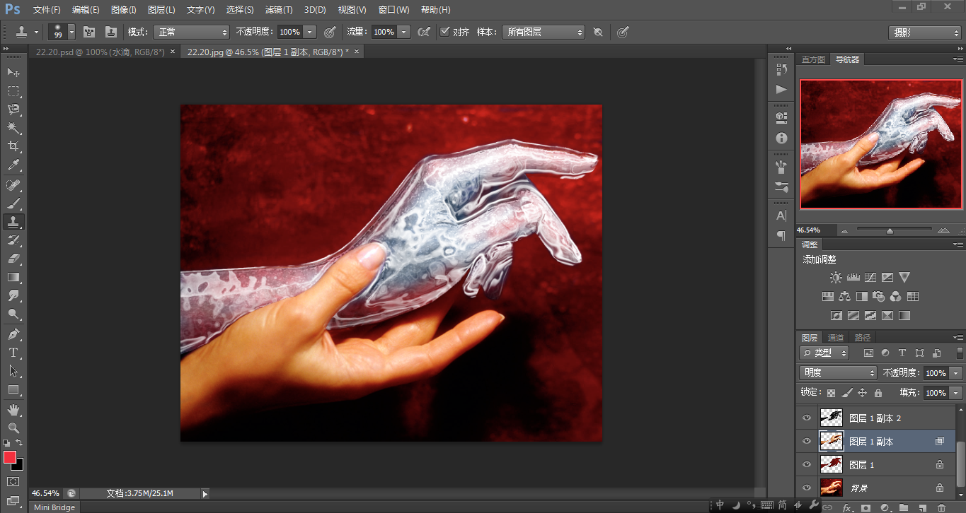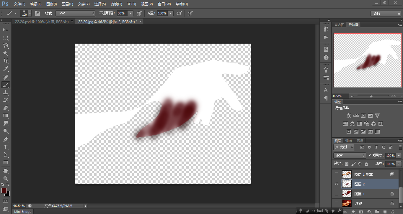 我们试想,如果左手是透明冰雕,那么右手被遮挡部分也应该依稀可见,所以在图层2中绘制手指效果