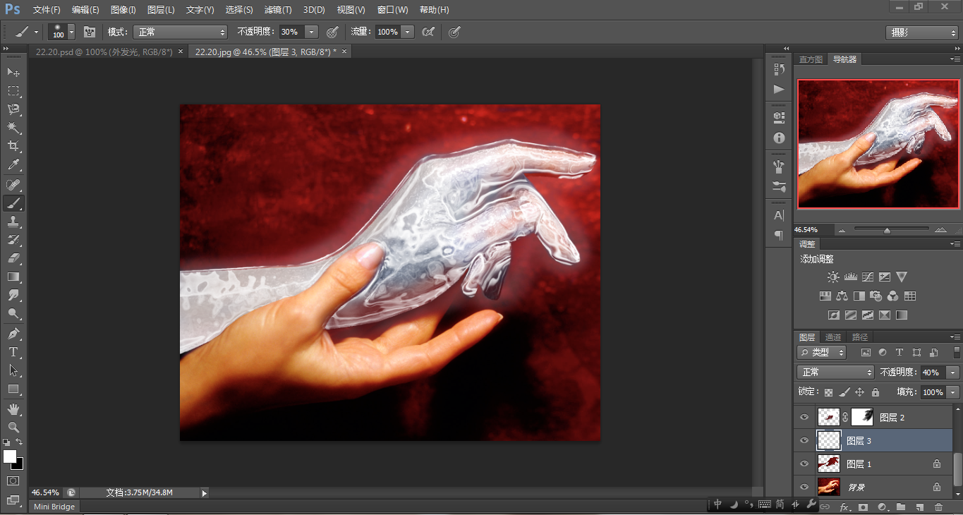 设置图层2不透明度为80%,添加蒙板,用灰色和黑色涂抹手指区域,使该部分不至于太亮,新建一个图层设置不透明度为40%