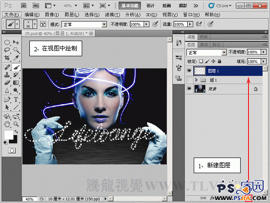 (9)打开素材文件科幻人物.psd文件,选择画笔工具选择自定义的画笔并运行设置。 (10)新建图层 1,在视图中运行绘制。 (11)为图层 1其添加图层样式