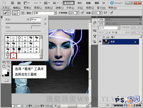 (9)打开素材文件“科幻人物.psd”文件,选择“画笔”工具选择自定义的画笔并运行设置。