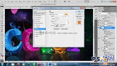 45、选用的颜色:2E5E0B,一下是以上步骤的效果图: 46、这是字母O的设置: 47、选用的颜色:F0B263。 48、突出模式的颜色:FFC580;阴影模式的颜色:E0731