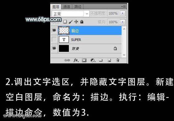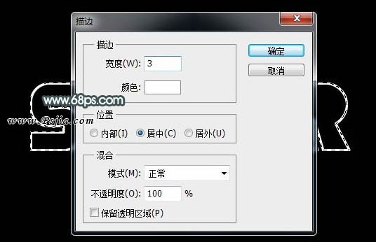 2、调出文字选区,把文字图层隐藏。新建一个图层,命名为“描边”,选择菜单:编辑 > 描边,宽带为3,颜色为白色,如下图。