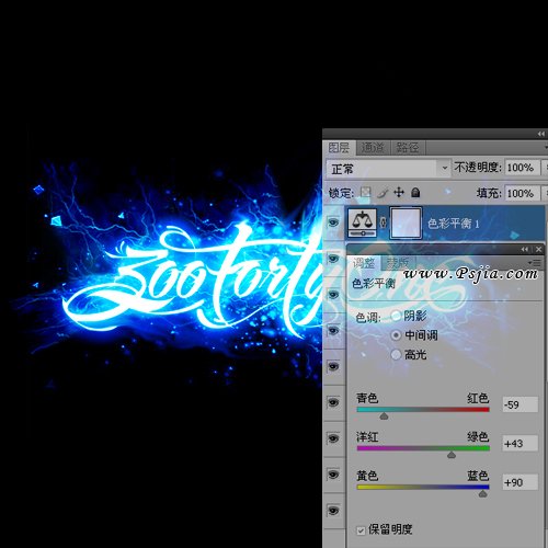 步骤六:为了让整个画面看上去更协调,最后我用了色彩平衡。(步骤五的时候,我多复制了一个文字图层。在用涂抹工具根据闪电的方向在光晕部分处理了下。)