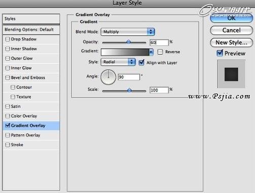 选择背景层,去层>图层样式>渐变叠加。选择灰色(#707070)和白色。混合模式更改为正片叠底,60%的不透明度。样式为径向。确保白色在中间。可以看到使用了正片叠底之后图像的边缘会变暗。我是通过图层样式应用这个渐变,因为稍后我想在图层上添加一个滤镜,然后我就可以尝试不同的颜色。(图02)