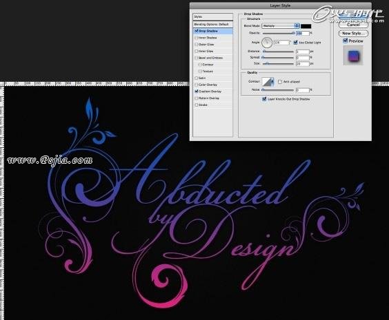 渐变叠加之后选择投影。使用正片叠底的混合模式,120度角,5像素的距离和20像素的大小。(图11)