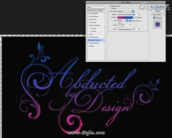 现在,你已经得到了带有花纹的文本,把它们转换为智能物体。这样,我们随时可以进行编辑。然后去层>图层样式>渐变叠加。使用粉色和蓝色,样式为线性,90度角。(图10)
