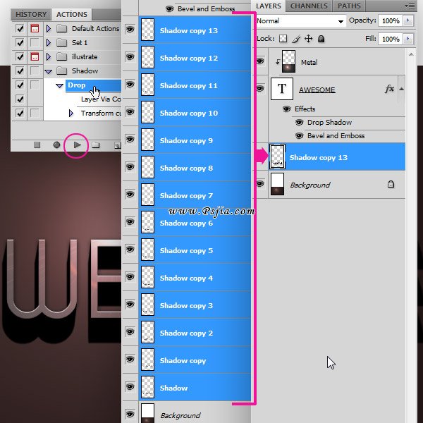 确认选中了"Shadow copy "层,在动作面板选中录好的Drop动作,狂按约12次,之后选中所有影子图层,Ctrl+E向下合并为一层。(图10)
