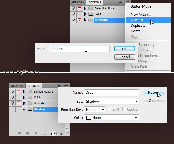 打开窗口>动作(Alt+F9),点击调板右上按钮,新建组,命名Shadow。点击右下方按钮新建动作"Drop–创建新动作",点击录制按钮开始录制。(图08)