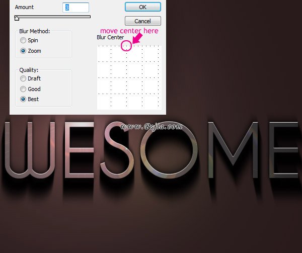添加模糊,使用滤镜>模糊>径向模糊,将模糊中心移动到顶端中心。数量:3;模糊方法:缩放;质量:最好。(图11)