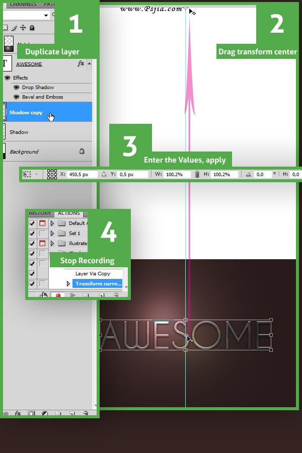 首先选中"Shadow"层,Ctrl+J复制一层,Ctrl+T进入自由变换,把旋转中心点拖到顶端中央。