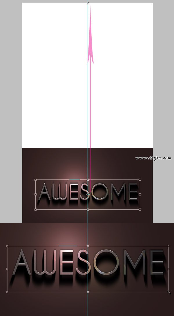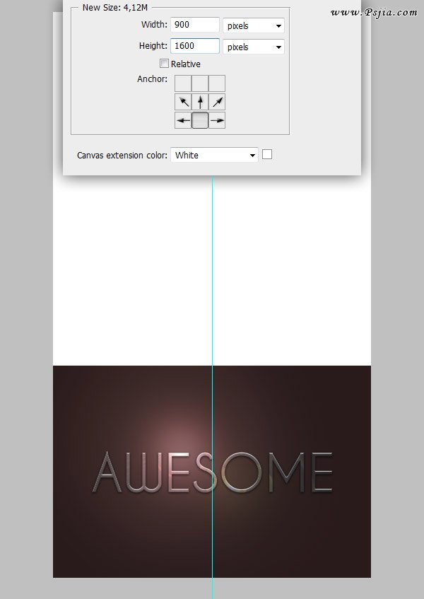 给影子创造空间。首先使用图像>画布大小,点击九宫格下中部(注意相对按钮不要打钩),改高度为1600px,Ctrl+R打开标尺(在标尺处按住左键可拖出辅助线)。在中轴拉一条辅助线,将"Awesome”层水平中心与之对齐。(图07)