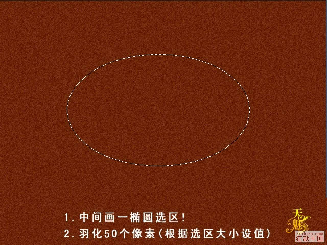 3、用椭圆选框工具在中间拉出下图所示的椭圆选区。 4、按Ctrl + Alt + D 羽化50个像素,数值可以根据选区大小自定设定。 |