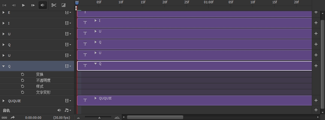 在时间轴面板中,打开第一个字的下拉菜单,如图