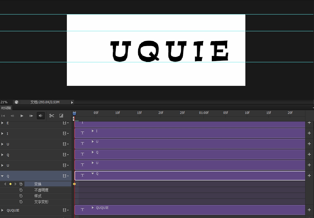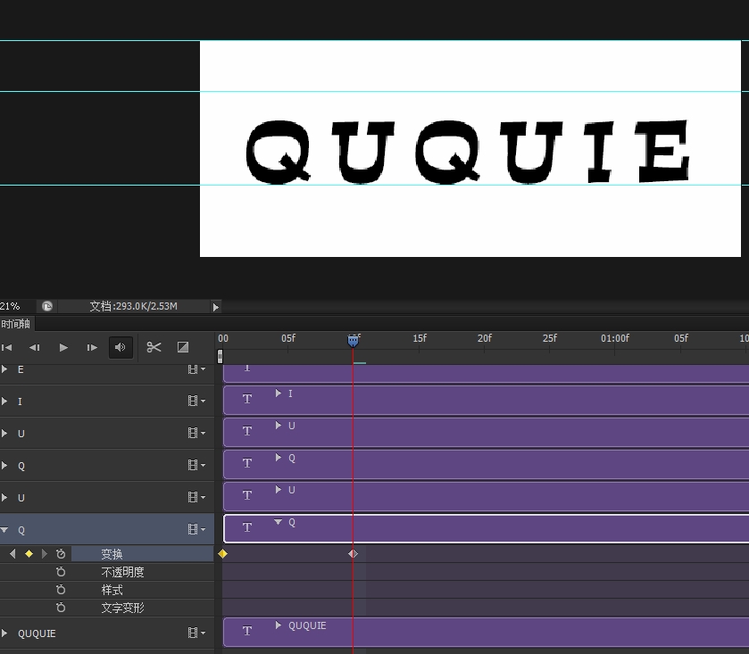 把第一个“Q”垂直向上移动,刚刚好移出屏幕就行,不要移太远,然后在“变换”前的秒表上按一下,时间轴里就建立一帧了