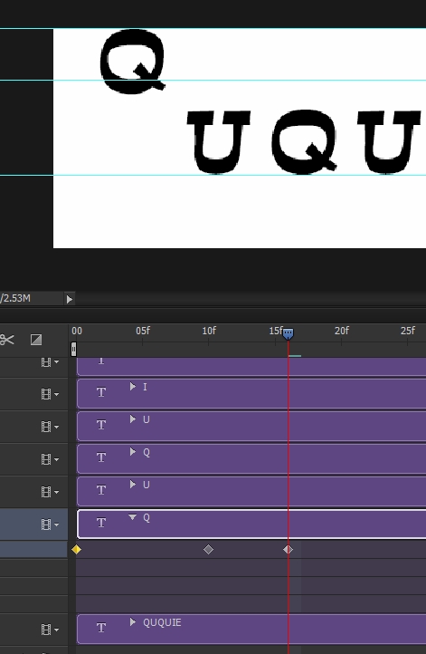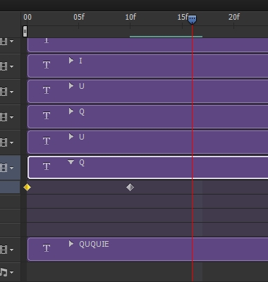 把第一个Q垂直向上移动,刚刚好移出屏幕就行,不要移太远,然后在变换前的秒表上按一下,时间轴里就建立一帧了 如图,先把蓝色按钮拖到10f位置,然