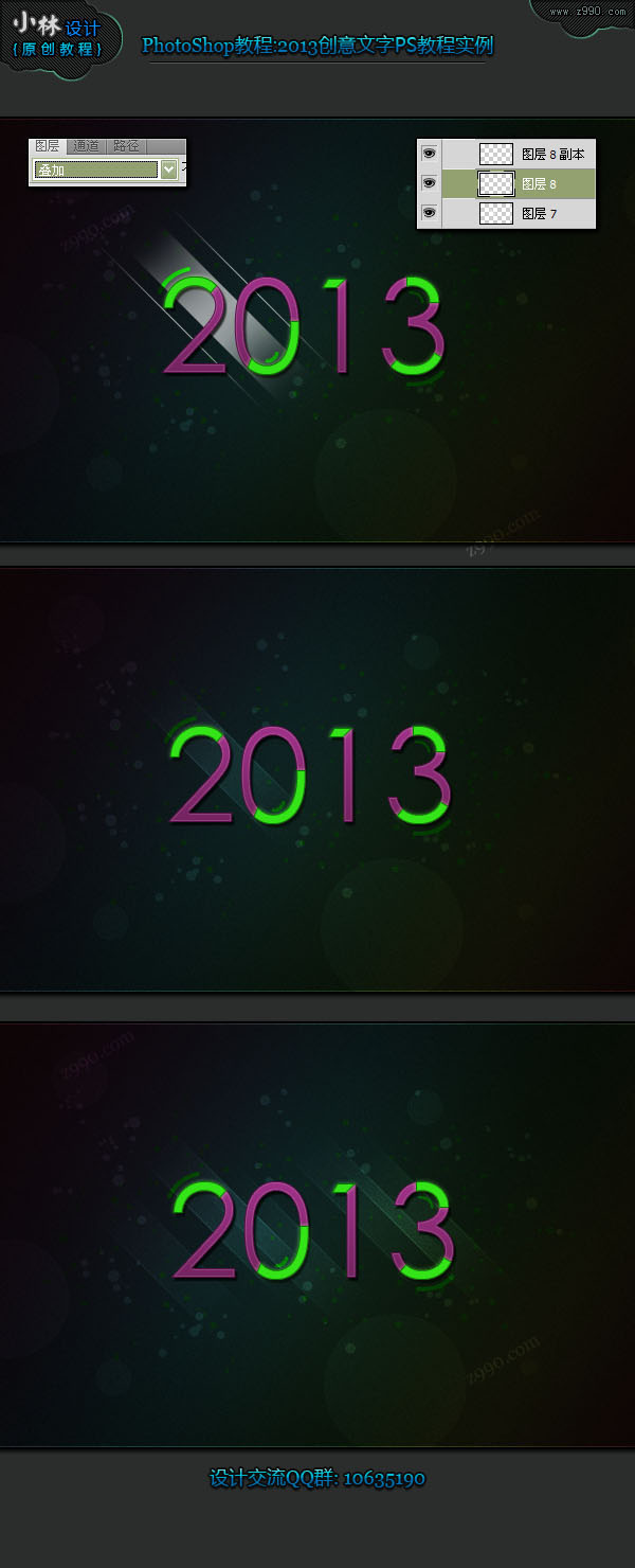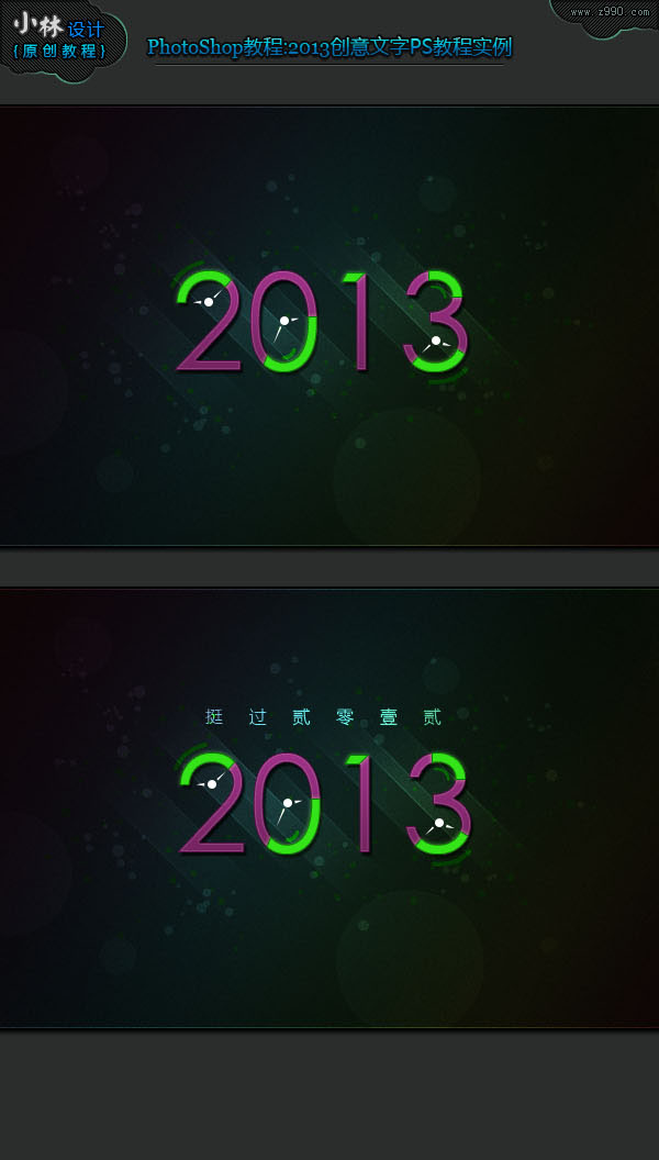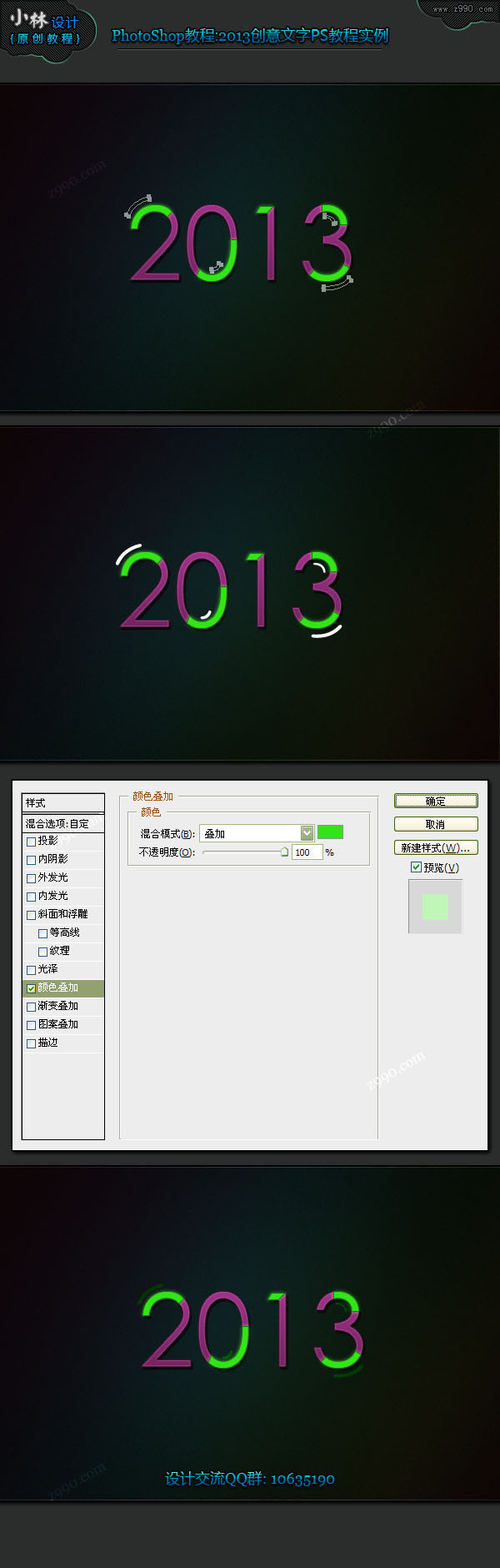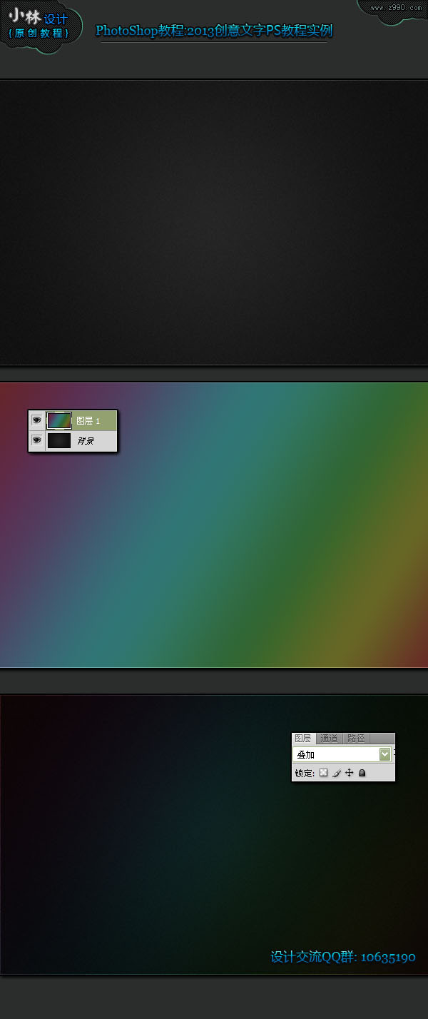 1,最终效果; 2,对背景进行径向渐变(#2d2d2d--#101010); 新建一层,使用彩虹渐变(颜色要比默认的彩虹色要深,使用线型渐变);将此层改为叠加图层模式; 3,输入文字;再将文字