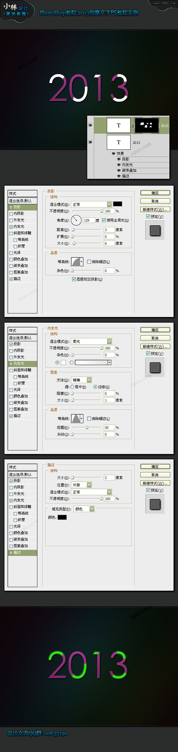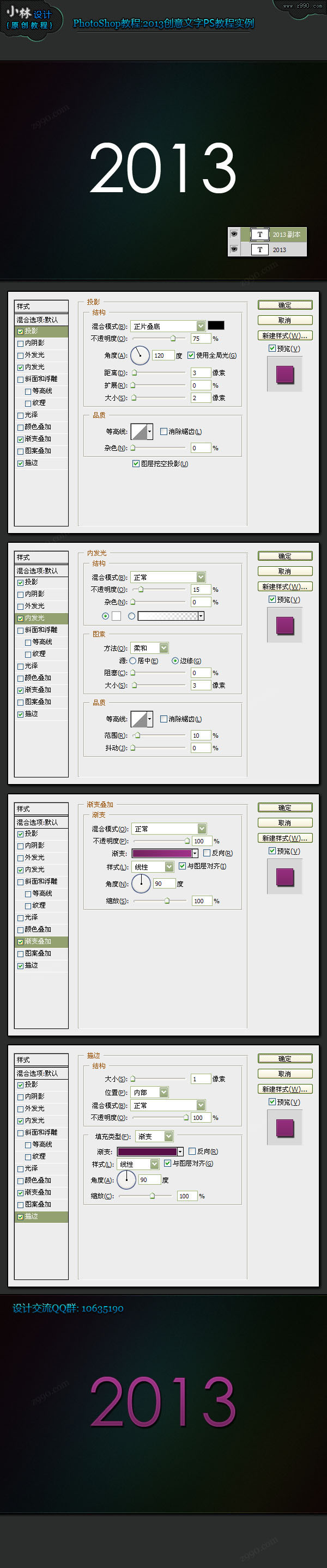 3,输入文字;再将文字复制一层,两层的文字一定要重叠,如图;再选下面的文字层,添加图层样式,如图所示;