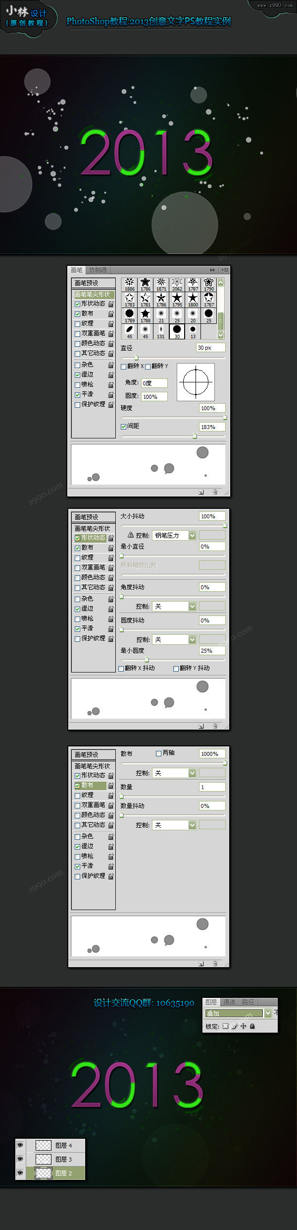 6,调整画笔;如图调整画笔的笔尖形状,形状动态,散布,湿边,平滑等设置;分别建立三层,画些大圆,小圆等;然后将层改为叠加图层模式;如图;