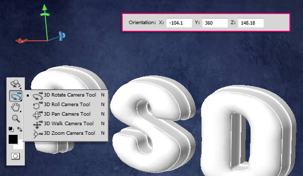 从工具箱中,使用相机的工具来改变相机的角度(视图),因为我们不想改变网格的位置。一旦你选择相机的工具,你可以点击和拖动来更改值,或这样做,你可以简单地使用3D轴。如果你想,你可以在选项栏中取向字段输入一些精确值。