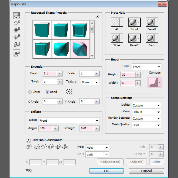 根据凸纹形状预设,选择充气边。然后,根据拉伸改变深度为0.1,下充气,改变角度为100,强度为0.05,伞下,从侧面下拉菜单选择正面,设置高度为30,宽度为6,并选择湾 - 深轮廓。