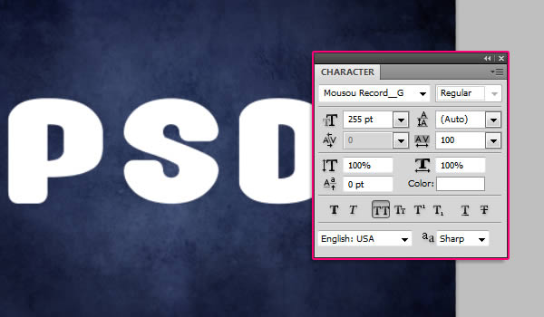 创建使用全部大写字体Mousou记录ĝ色白中的文本。大小是255 pt和“跟踪”的值设置为100,以创造更多的字母之间的空间。