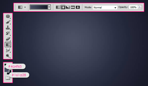 创建一个新的1024×768像素的文件,或者任何你需要的大小取决于你将创建的文本。然后,设置前景色为#4a4f65和背景颜色为#161a28,径向渐变填充背景(从中心到边角之一)。