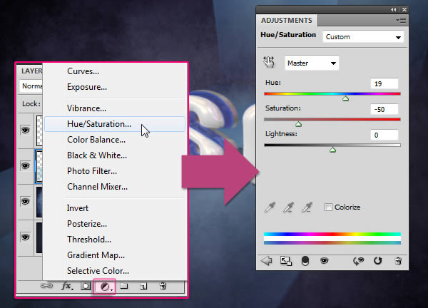 下来“图层”面板中点击“创建新的填充或调整图层”图标,选择“色相/饱和度,并改变色相值19和饱和值-50。