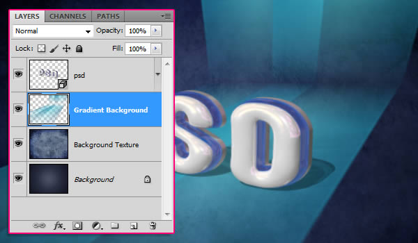 确保明显的梯度层选择(活动)。按按Ctrl / Cmd + T将进入自由变换模式,然后按下Ctrl / Cmd的键和移动的角落的梯度创建一个幻想的3D背景的文本。
