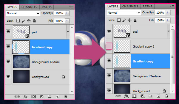 第9步 同时选择渐变层,去图层合并图层,然后复制合并后的新层。复制合并层无形的,通过点击它旁边的眼睛图标。 确保明显的梯度层选择(活动)。按