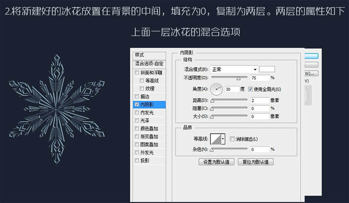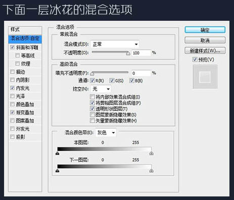 7、将新建好的冰花放置在背景的中间,填充为:0%,复制为两层。两层的属性如下,上面一层冰花的混合选项如下。