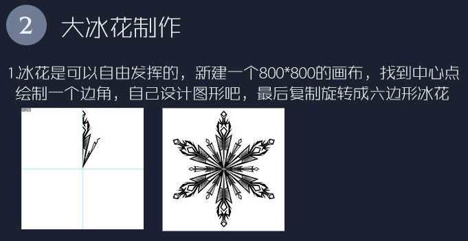 6、大冰花制作:冰花是可以自由发挥的,新建一个800 * 800的画布,找到中心点绘制一个边角,自己设置图形吧,最后复制旋转成六边形冰花。