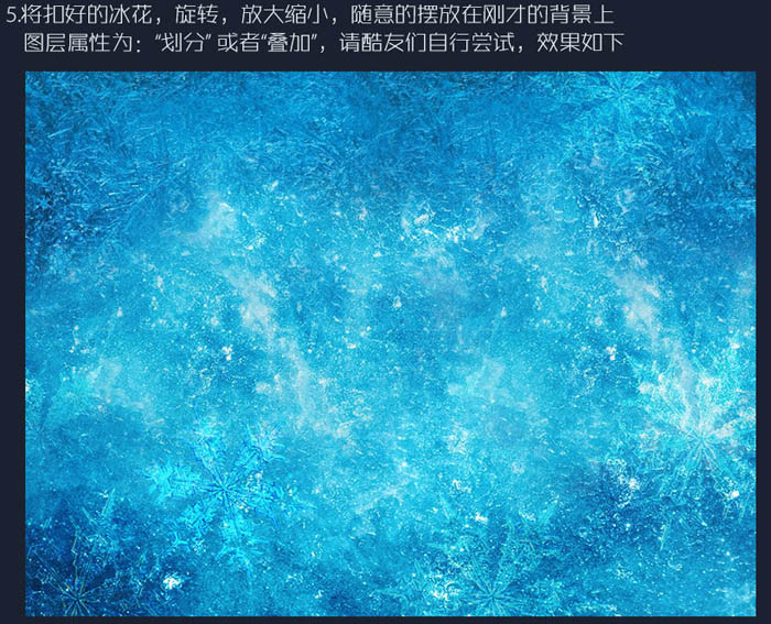 5、将抠好的冰花旋转,放大缩小,随意的摆放在刚才的背景上,图层模式为“划分”或“叠加”,效果如下图。
