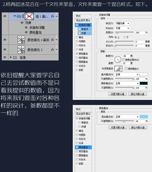 用冰雪纹理模仿冰雪奇缘的冰冻字3 8、将两层冰花合在一个文件夹里面,文件夹需要一个混合样式如下。 9、添加蒙版,擦除横向中间的部分,为中间的文