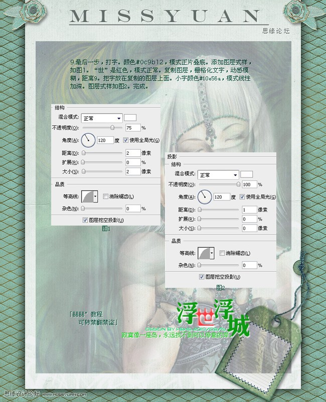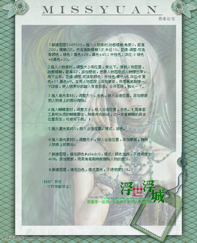 效果图 教程 纠正:第6步,拖入高光素材2,图像-调整-色相/饱和度90 -40 -39,模式绿色。不透明度70%。 第7步,第一次新建图层添加的颜色是#69f876。蝴蝶素材的图层,亮度+70。 素材
