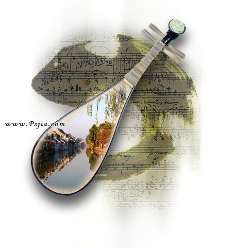 9、用磁性套索工具勾出琵琶的主体部分,然后"选择-修改-缩小2,再羽化5左右,由自己决定吧。再把江南景色贴入勾选的部分内,这里有图参考。