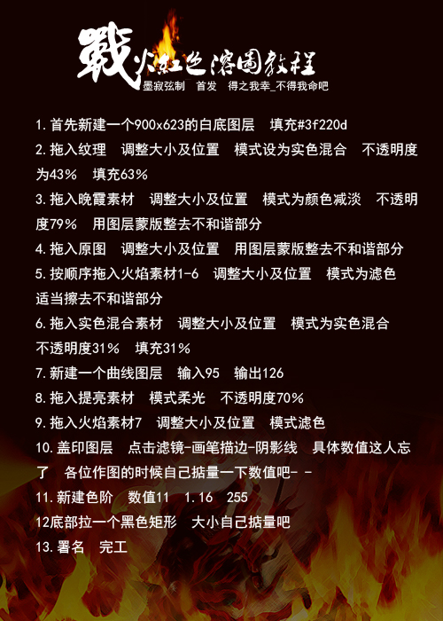 效果 原图 教程 图层摆放1 图层摆放2 副标题 素材 实色混合素材 提亮素材 晚霞素材 纹理 火焰素材1 副标题 火焰素材2 火焰素材3 火焰素材4 火焰素材5 火焰素材6 火焰素材7